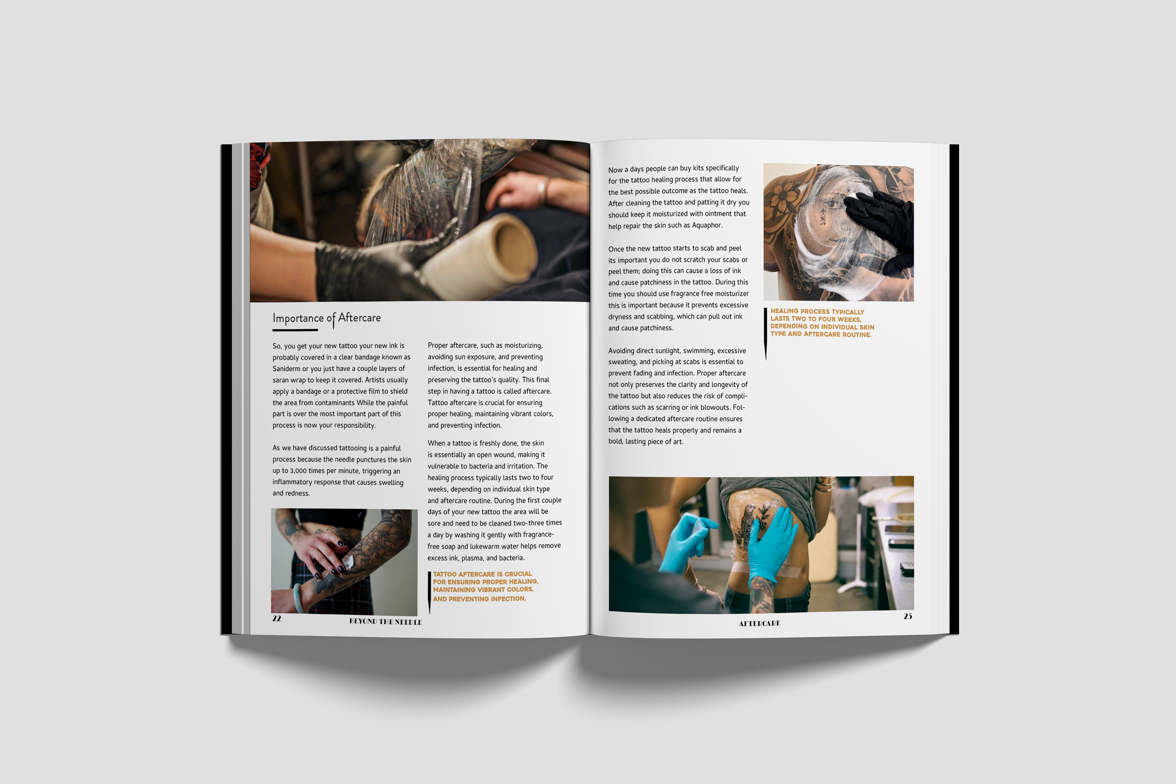 “Beyond the Needle” was created to demystify the tattooing world and highlight the art form’s emotional and cultural significance. Through this project, I aimed to not only educate but also empower readers to see tattoos and design as tools for personal expression, communication, and transformation.